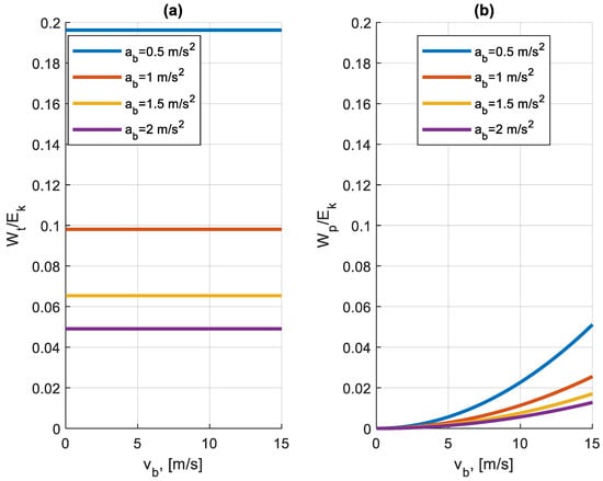 The ratio of the work of the motion resistance forces to the kinetic energy Ek at the start of braking for different values of deceleration ab (vb—the speed at which braking is initiated), (a) the ratio of the work Wt of the rolling resistance forces to the kinetic energy Ek, (b) the ratio of the work Wp of the air resistance forces to the kinetic energy Ek.