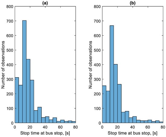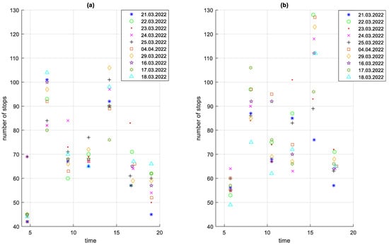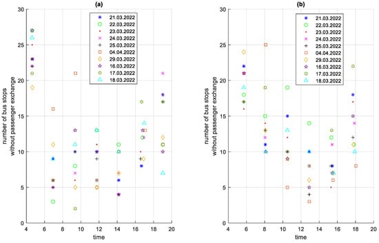Due to the road layout with separated traffic directions streets, both routes are not the same. There are 35 bus stops on the route in the A to B direction and 38 bus stops in the B to A direction. In the A to B direction, the route is 16.376 km long and in the B to A direction 16.805 km long. Depending on the time of day and the direction of traffic, the total number of stops on a given course varies. The highest number of stops occurs during the morning and afternoon rush hours. This is shown in Figure 5.