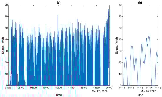 All the routes under consideration are operated by the same bus running the same daily schedule. In direction A to B, the bus makes seven trips per day and in direction B to A six trips per day. Figure 6a shows an example of the speed profile during the day on 25 March 2022. The speed of the bus in urban traffic very rarely reaches values greater than 15 m/s, which corresponds to a value of 54 km/h.