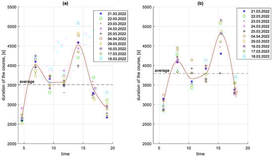 Course durations in the studied period depending on the time of the start of the course: (a) in the direction A to B; (b) in the B to A direction.