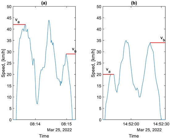 Graph of bus speed from two selected parts of the route between bus stops (va—acceleration speed after the stop, vb—braking speed before the stop): (a)—morning rush hour, (b)—afternoon rush hour.
