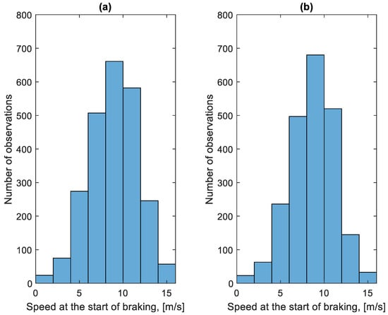 Distribution of braking speeds forced by traffic conditions in the studied period: (a) in the direction A to B; (b) in the B to A direction.