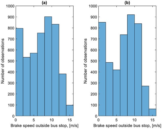 Distribution of braking speeds before the bus stop in the studied period: (a) in the direction A to B; (b) in the B to A direction.