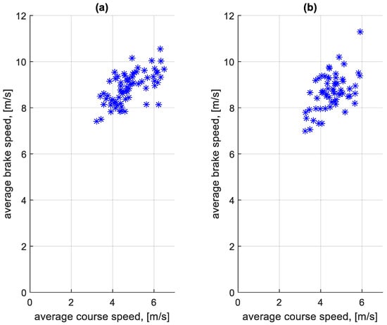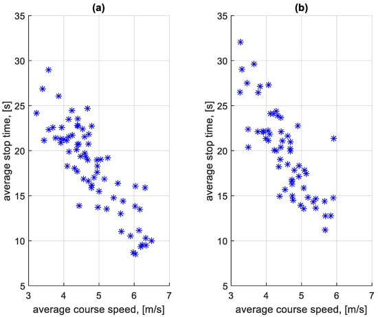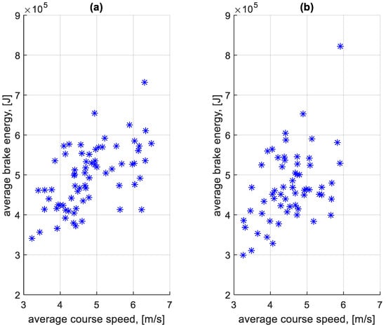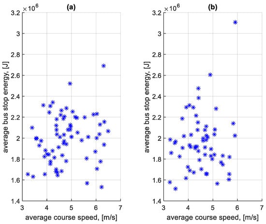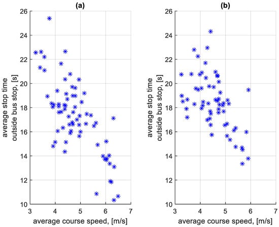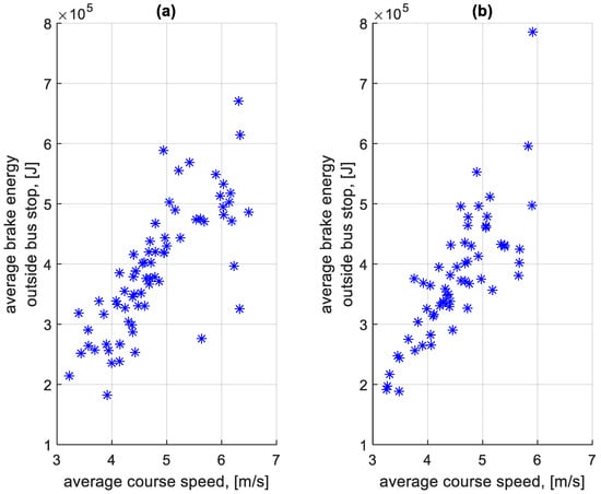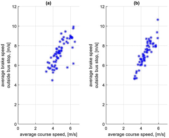 In the case of Figure 11, there is little change in the average braking speed before a bus stop on the course from the average speed on the course. As Figure 9 shows, the majority of braking speeds before the bus stop are clustered between values of 6 m/s and 12 m/s. In Figure 12, the significant effect of the average speed on the course is seen on the average braking speed outside the bus stops on the course. When moving in a traffic jam, the vehicle moves at low speeds, hence the low braking speeds. At higher average speeds on a given course, the braking process resulting from, for example, pedestrians at a crossing or traffic lights takes place at a higher speed, close to the braking speed before the bus stop.