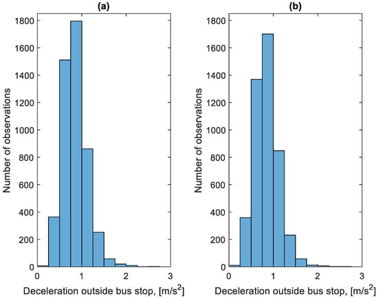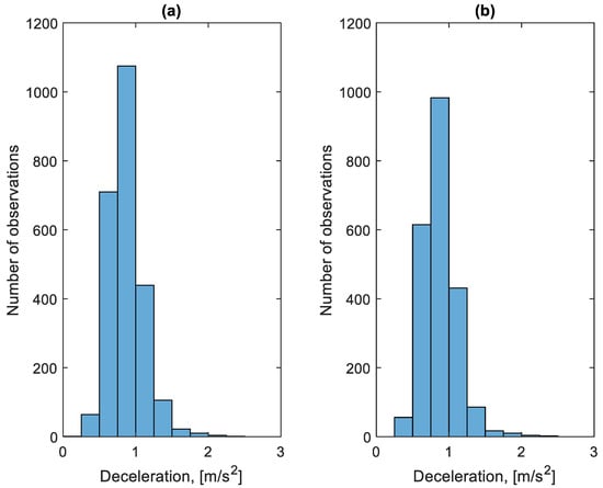 Distribution of decelerations during braking outside the bus stop: (a) in the direction A to B; (b) in the B to A direction.