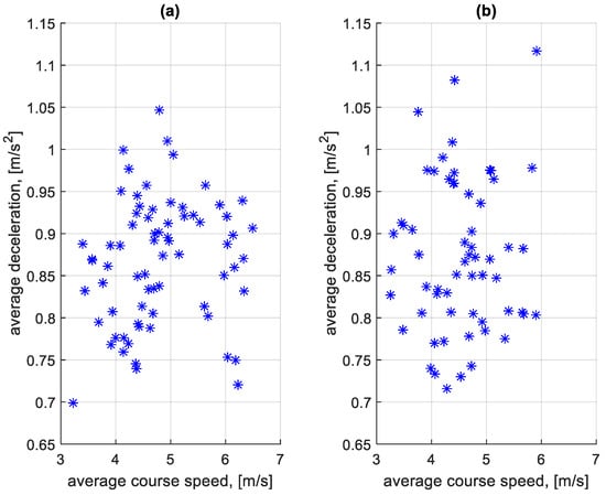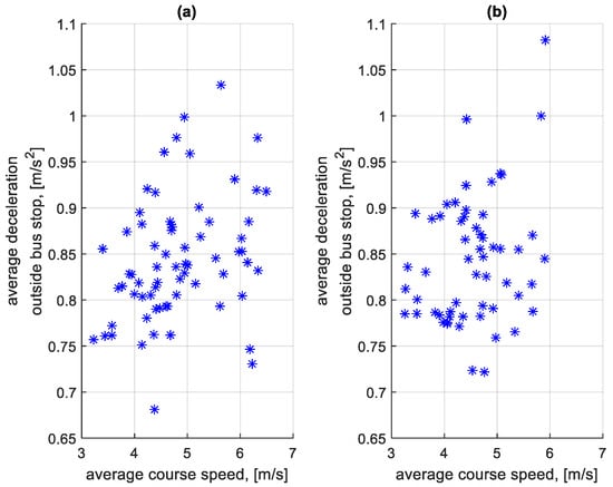 Similarly to the braking speeds in Figure 11 and Figure 12, an analysis of the effect of the average speed on a given course on the average deceleration on the course was also carried out. The dependence of the average deceleration during the braking process before bus stops on a course on the average speed on a course is shown in Figure 15. The dependence of the average deceleration during the braking process outside bus stops on a course on the average speed on a course is shown in Figure 16.