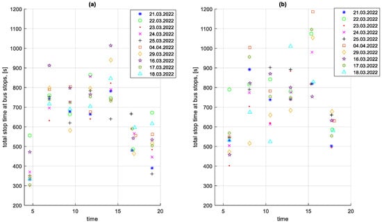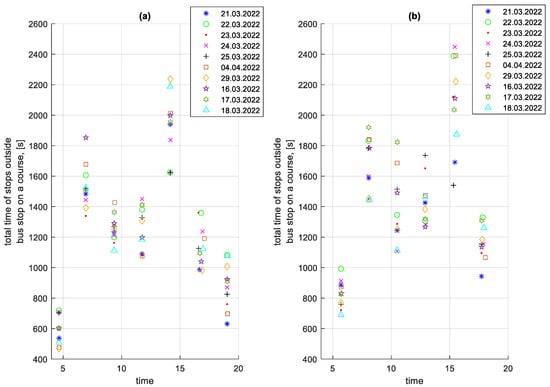 Total stop times at bus stops on a given course depending on the time of the start of the course: (a) in the direction A to B; (b) in the B to A direction.