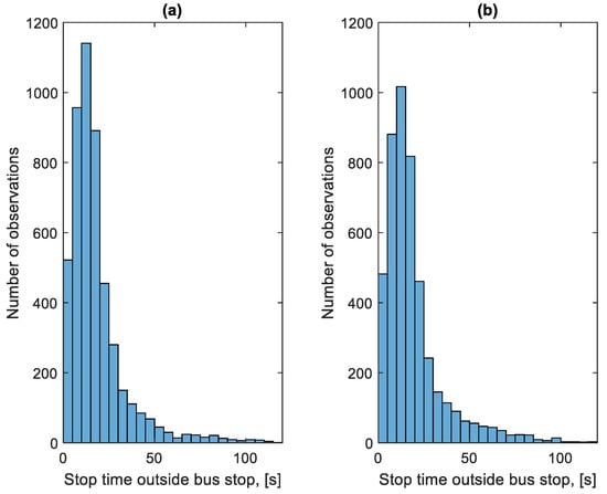 As can be seen in Figure 6b, there are four phases in the movement of a public bus: the acceleration phase, the braking phase, the steady speed phase, and the stopping phase. The stopping phase results from the need to stop at a bus stop and from the current traffic conditions, e.g., stopping in front of traffic lights.