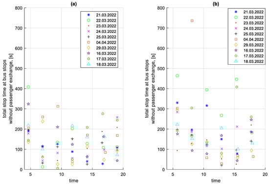 An important element that affects the average speed on a given route is the stop times at and outside bus stops. In addition, these stop times contribute to increased fuel consumption. The total stop times at bus stops on a given course for the studied period are shown in Figure 17. The total stop times outside bus stops on a given course for the studied period are shown in Figure 18.
