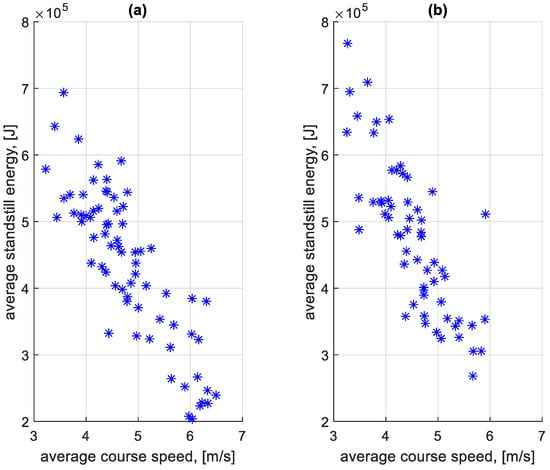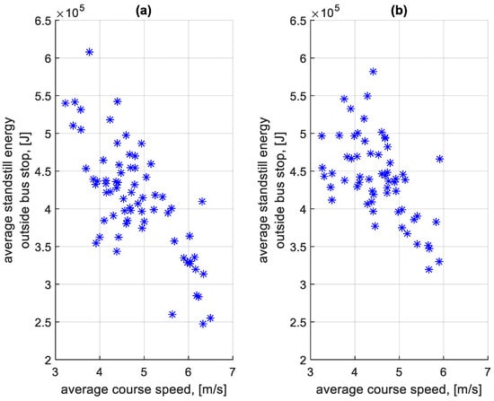 Average standstill energy of stopping outside a bus stop on a course depending on the average speed on a given course: (a) in the direction A to B; (b) in the B to A direction.