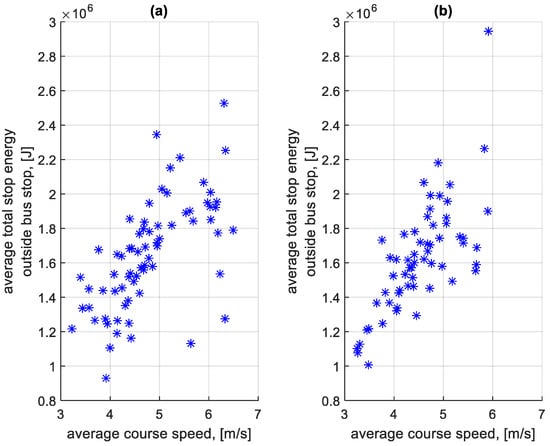 When summing the braking and standstill energy loss for each stop, the total braking and standstill energy loss was obtained. From this value calculated for each stop on a given course, the average total energy lost per stop on a given course was determined. Figure 29 shows the dependence of the average total energy lost per stop at a bus stop on a course on the average speed on a given course. Figure 30 shows the dependence of the average total energy lost per stop outside a bus stop on a course on the average speed on a given course.