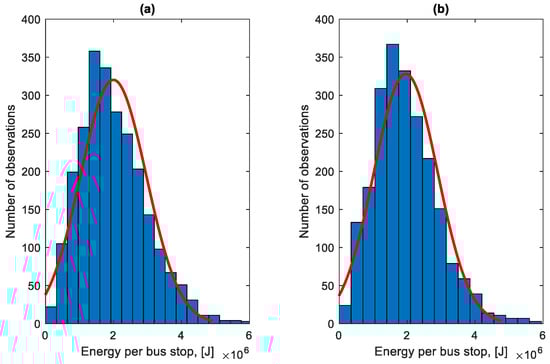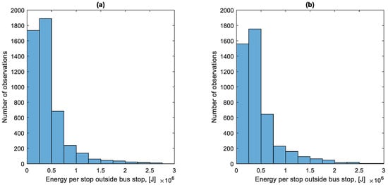 Distribution of the total energy lost per stop outside a bus stop: (a) in the direction A to B; (b) in the B to A direction.