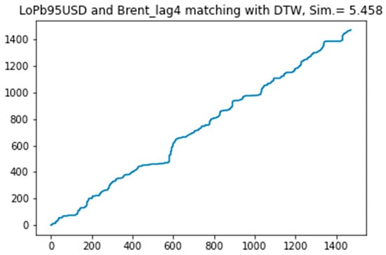 The distance measures for time series aim to provide a measure of the general similarity of bivariate time series. Given two time series, T1 and T2, the particular similarity function Dist calculates the distance between the two time series, denoted by Dist(T1, T2). There are dozens of propositions for the Dist function (for a comparison, see [35]). However, one can focus on representatives of Dist encompassing three distinct approaches to distance calculation: a comparison of the i-th point of one time series with the i-th point of another (e.g., Lp norms and all methods based on one of the Lp norms, like LB_Keogh, which is a DTW indexing method but can be used as a distance measure), a comparison of one-to-many points (e.g., Dynamic Time Warping, DTW) and one-to-many/one-to-none point comparisons (e.g., Largest Common Subsequence, LCSS). Figure 1 presents an example of DTW—a DTW-based measure of similarity between the spot price of Brent crude oil (lagged 4) and the wholesale price of standard 95 octane gasoline offered by the Polish company LOTOS.
