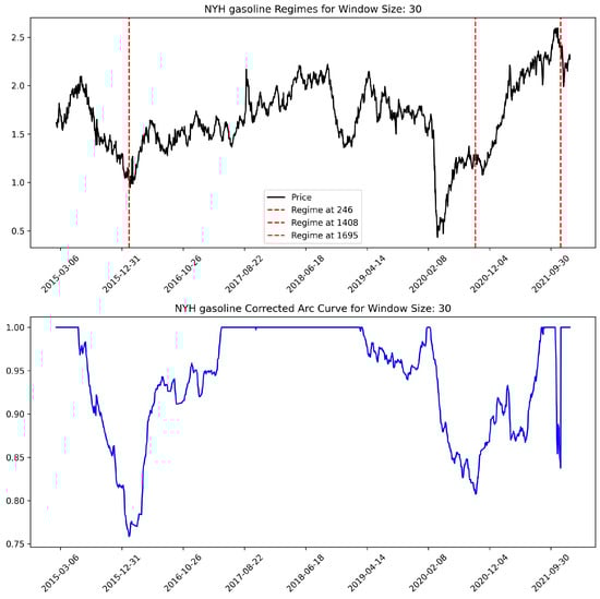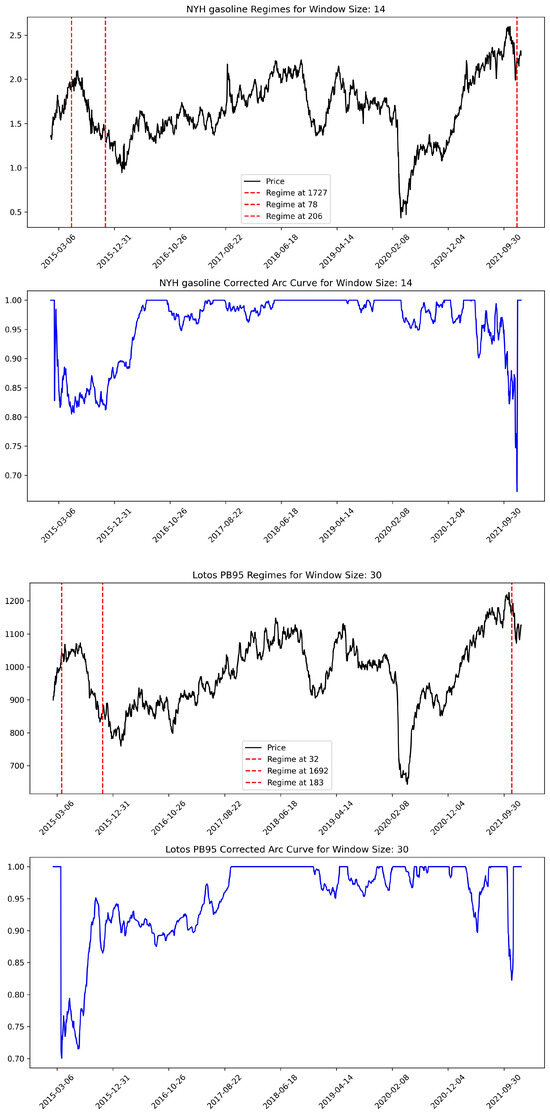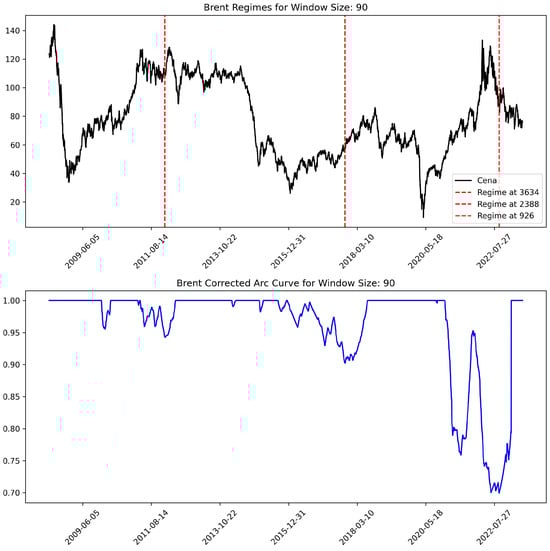 Figure 4 contains the results of regime detection in the time series of Brent crude oil spot price (in the upper part, three points of change in the behavior of the time series are detected and marked by a red dotted line, and the lower part depicts the so-called CAC used in regime detection).