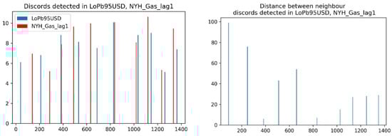 The next screening step, following point (b), contains the discovery of discords in a price’s path. There are many unsupervised machine learning algorithms designed for such tasks. Some of the most popular tools are those based on the Symbolic Aggregate approXimation (SAX) transformation. SAX is a dimensionality reduction method that transforms a time series into a symbolic representation [51]. It applies Piecewise Aggregate Approximation (PAA) to reduce the dimensionality of the time series and maps the PAA segments to symbols. For discord discovery with SAX representation of time series, we used the HOTSAX algorithm [37]. The HOTSAX (Heuristically Optimized Time Series using SAX) algorithm is a time series anomaly detection algorithm that extends the SAX technique. The algorithm is designed to identify discords or anomalies efficiently within a given time series dataset. A Python implementation of HOTSAX, included in the library SAXPY [52], was used. Figure 7 shows the results of the discords’ discovery and depicts the distance (in working days) between each pair of the nearest discords detected in both time series. For example, there are discords placed about the data point 400 in both series, and one can see that the placement of those discords is nearly the same. The distance between those discords, shown in Figure 7, is six days.