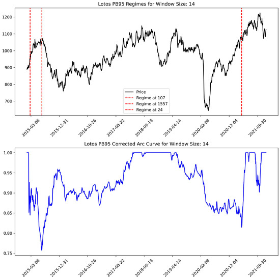 All algorithms based on a matrix profile need to pass, among other things, two of the most important parameters: the length of the subsequence (window size) and the number of “matches” we look for in data. In the presented empirical case study, we examined times series with window sizes of 14 and 30 days, looking for up to three regimes. The Python 3 matrix profile library version 1.1.10 [54] was used for calculation. Figure 8 shows the results for the time series selected to present the empirical example.