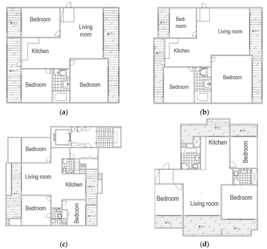 Floor plan of house units from the four apartment complexes: floor plan for (a) A, (b) B, (c) C, and (d) D apartment complex.