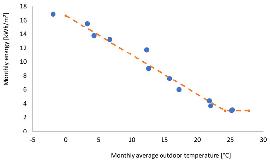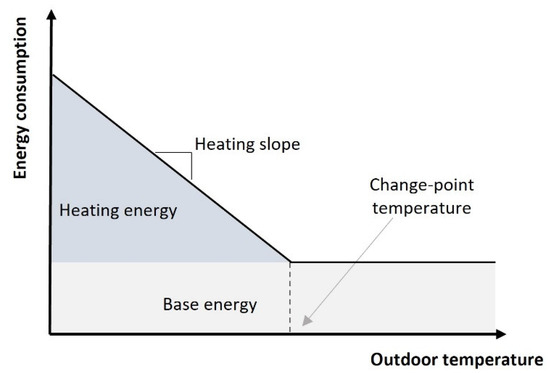 where is the monthly energy consumption, is the monthly base energy consumption, is the heating slope, is the heating change-point temperature, is the average monthly outdoor temperature, and is the heating energy consumption. The superscript in Equations (1) and (2) indicates that the value in parentheses is zero for negative values.
