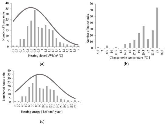 Distribution of the results from the change-point regression model: (a) heating slope; (b) change-point temperature; and (c) heating energy. The curve lines indicate similar trend in variations of the obtained heating slope and heating energy.