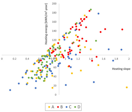 House units in the first quadrant (upper right quadrant) have a high heating slope (sensitivity to outdoor temperature variation) and a high heating energy consumption. This implies that the energy performance of these houses can be enhanced by improving the thermal performance of the external envelope and the efficiency of the heating equipment. In the second quadrant (low heating slope and high heating energy consumption), the house units are characterized by high user-induced energy consumption. This category may include house units occupied by people with particular indoor thermal requirements (such as children, elderly occupants, or simply occupants with special preferences in terms of indoor conditions). The third quadrant (lower left quadrant) consists of house units with a low heating slope and a low heating energy consumption. A low heating slope indicates a low sensitivity of heating energy to outdoor temperature variations as a result of good building thermal performance. Therefore, house units in the third quadrant are classified as energy efficient house units. The last category, the fourth quadrant, has house units characterized by a high heating slope (poor thermal performance) but low heating energy use (due to occupant schedules or the intermittent operation of heating systems).