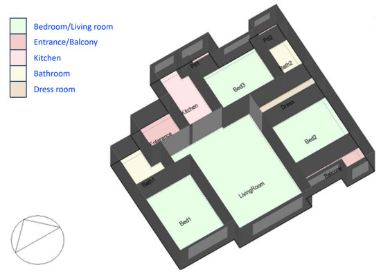 The base model consisted of five conditioned zones: three bedrooms, a living room, and a kitchen (Figure 6). Building characteristics, such as orientation, window-to-wall ratio, total and heated floor area, etc., were collected through site visits and internet searches. Regarding the model’s thermal properties, we used Korean building regulations from the year 1996 (when apartment complex B was built) to define the model’s envelope elements. Table 4 shows the characteristics and input parameters of the model designed in the DesignBuilder/EnergyPlus program. In addition, an EPW (EnergyPlus weather data) file for 12 months (December 2010 to November 2011) was created and used in the simulation. The predicted heating energy was compared with the actual gas consumption of the housing unit for model validation (see Section 3.3.1).