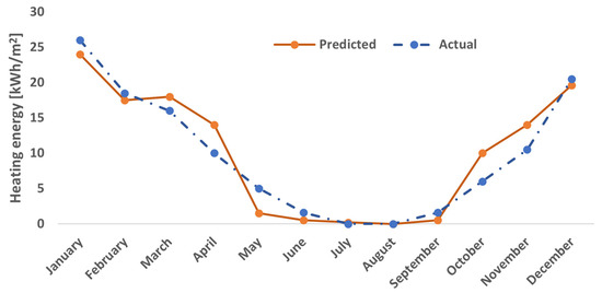 Comparison between actual heating energy and heating energy predicted from the base model.