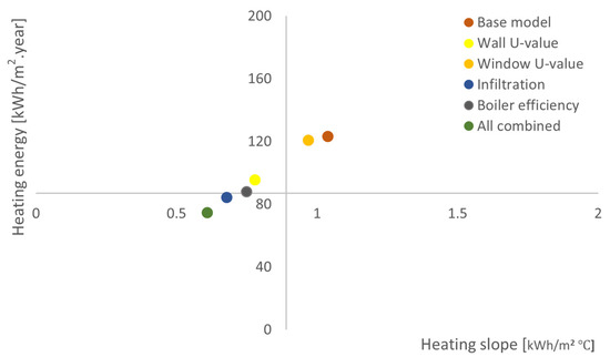 Table 6 shows the improvements in heating slope and heating energy resulting from the four retrofit measures individually, as well as the improvements based on all the measures combined. Reducing the infiltration rate showed the highest improvement in house unit energy performance, followed by improving the boiler efficiency and wall thermal transmittance. The retrofit measure for window transmittance showed a lower heating energy and slope reduction compared to the other measures. This is due to the small window glazing area and the orientation of the windows. The analyzed house unit is oriented to the south, and during the heating season, solar heat gain contributes to the reduction of energy needed for space heating.