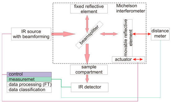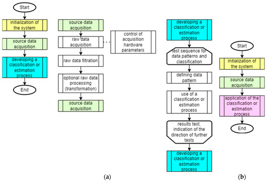 Both algorithms contain a procedure called the initialization of the system, marked in yellow in Figure 1, used for equipment and measurement initiation [110]. The system initialization procedure often deals with issues related to the synchronization of the operation of the measuring equipment with the acquisition system. The initiation procedure frequently involves performing reference measurements in a system without a sample. In addition, the initialization typically determines the measurement’s thermal parameters, including the sample’s temperature and the environment. These data are used for temperature regulation or are transferred to data acquisition procedures, as well as classification and estimation, to correct the effect of temperature on the results obtained.