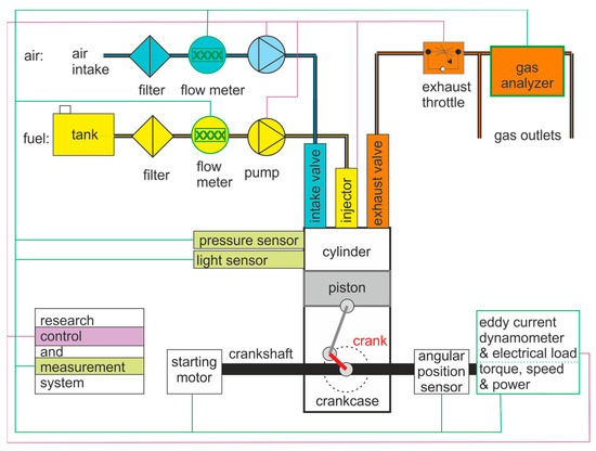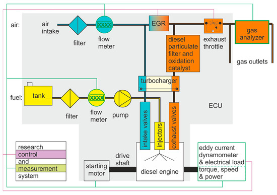 The sample setup includes a standard diesel engine sectioned into modules necessary for today’s engine and a set of modules for multiparametric measurements. Modern engine modules include turbochargers, an exhaust gas recirculation unit (EGR), and an engine control unit (ECU). The ECU can obtain information from installed engine sensors. The sensors can be mounted in air inlets, fuel lines, the exhaust, the EGR, and drive shafts. The ECU acts on the set of engine actuators, such as the fuel injectors, intake valves, and valves in the EGR unit. The modules for the multiparametric measurements include fuel consumption sensors, air intake, exhaust gas analysis, and an eddy current dynamometer. Such setup configurations enable the monitoring of the engine power, torque, speed, and exhaust gas emissions for many examination principles.