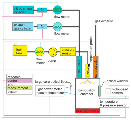 The modern examination of the diesel fuel ignition delay requires the equipment of such an engine with a series of sensors and electronic actuators. The fundamental functions of the sensors are to monitor the pressure inside of the cylinder and the crank angle. The temperature and heat release can be assessed based on the pressure, while the moment of ignition can be deduced from the crank angle position [139]. The peak heat release rate estimates an ignition moment, while the ignition delay computes the period from the start of the injection to the ignition [140]. The ignition delay time (IDT) is the time from the beginning of the injection to the ignition moment. A sample setup of the diesel fuel CN measurement with the use of a laboratory engine is presented in Figure 3.