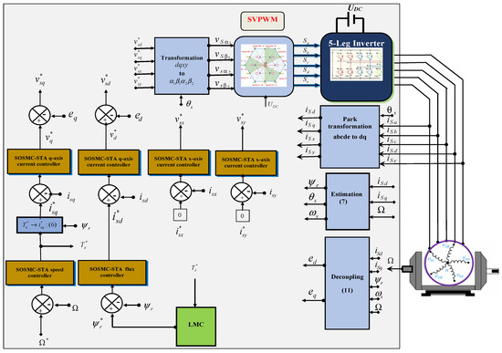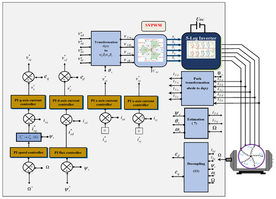 It should be noted that the control of Five-Phase Induction Motors (FPIMs) holds immense significance in various industrial applications. Unlike traditional three-phase motors, FPIMs offer superior performance, efficiency, and reliability. Precise control of these motors allows for smoother operations, reduced vibrations, and enhanced torque production, making them ideal for demanding tasks, such as robotics, electric vehicles, and aerospace applications. Thus, the two most widely recognized and used control strategies for motors, especially for Five-Phase Induction Motors (FPIM), are Direct Field-Oriented Control (DFOC) [7] and Direct Torque Control (DTC) [8]. In fact, DFOC is based on a rotor flux regulation loop and internal current control loops to achieve an independent regulation of the flux level and the load current component that describes the electromagnetic torque. The DTC enables direct control of the machine’s torque and flux levels by eliminating current control loops and using hysteresis controllers. Both control structures have advantages and disadvantages, extensively discussed in various publications [9], with one group of scientists supporting DFOC and another group of scientists supporting DTC. In modern industrial control applications, control structures must meet all requirements in terms of complexity, parameter sensitivity, dynamic performance, and cost. Ultimately, the choice between DFOC and DTC depends on the specific application requirements, as well as the cost and design complexities associated with each technique. DTC exhibits significant ripples in the electromagnetic torque and stator flux, remarkable distortions in the stator current, and variations in the switching frequency, which causes mechanical vibrations and switching losses, leading to premature ageing of the system [10,11]. On the other hand, DFOC offers good performance in terms of accuracy, reduced ripples and distortions, and constant switching frequency [12].