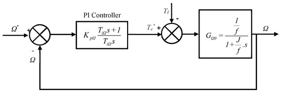 The block diagram of the closed-loop speed controller is depicted in Figure 2 [14,62]. The integral and proportional parameters of this controller are denoted as and , respectively. Ω and Ω* represent the actual and reference rotor speeds, respectively. and represent the reference and load torque, respectively. The adjustment of the speed controller parameters is carried out to achieve the desired performance of the closed-loop system by specifying the damping coefficient ξ and the natural frequency . Referring to Figure 2, the closed-loop transfer function can be expressed as follows: