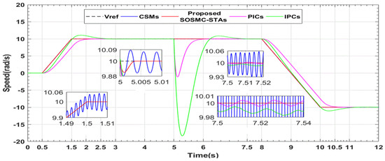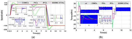 - A comparative analysis involving various simulation scenarios is conducted to evaluate the performance of PICs, IPCs, CSMCs, and our proposed SOSMC-STAs. The results indicate that the suggested controller outperforms the others across multiple criteria, including speed response time, speed overshooting, robustness against load disturbances and parameter variations, chattering reduction, and torque ripple minimization. Moreover, the proposed LMC offers satisfactory performance in terms of efficiency optimization.