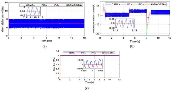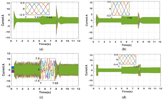- In their work, [46,47] introduced higher-order SMCs. The latter generalized first-order control by utilizing higher-order derivatives of the sliding surface (S) instead of restricting itself to just the first derivative. However, to implement such a controller, derivatives of the sliding variable were necessary, making this approach more demanding in terms of the required information for its design. An outstanding exception was the super-twisting sliding mode algorithm, which only requires the measurement of the sliding variable. This method is highly powerful and therefore very appealing for controlling three-phase induction motors and other applications, as was demonstrated in [14,48,49,50,51]. Currently, the latest control technique has been proposed by a few researchers for controlling the FPIM. Unfortunately, its performance has not been detailed in [52,53]. In their investigation [46], the authors used a Direct Field-Oriented Control (DFOC) method employing a second order Supertwisting Algorithm (STA) for a five-phase squirrel-cage induction motor. Although the supertwisting algorithm was proposed to enhance control loops for rotor speed, rotor flux, and currents, the study falls short in providing a thorough examination of the control system’s performance. Notably, aspects such as robustness under load torque disturbances, variations in rotor resistance, and the Total Harmonic Distortion (THD) of the stator current, especially at low speeds, have not been extensively discussed. In another related study [53], the authors presented an enhanced field-oriented control of FPIM using an STA exclusively for inner current control loops. Unfortunately, simulation studies in this work lack comprehensive details, as the authors only presented a scenario in steady-state operation without a load.