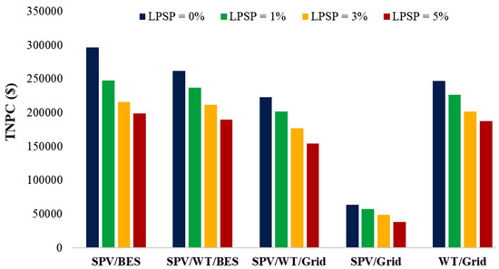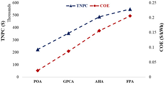 The Total Net Present Cost (TNPC) serves as a key economic indicator frequently employed to assess the optimized design of systems involving diverse configurations. It encompasses factors such as initial costs, component replacements, operational expenses, and maintenance costs. TNPC offers robust reliability compared to metrics such as the Cost of Energy (COE), which can be somewhat arbitrary. The following formula is utilized to compute TNPC [13].