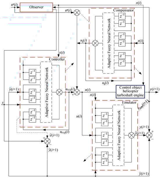 An key disadvantage of the ANFIS is its limited ability to adapt to complex and rapidly changing environmental conditions, which can lead to insufficient control accuracy in some scenarios. To eliminate these shortcomings, it is advisable to use an NFA ACS (Figure 2), proposed in [], in which the influence of disturbing influences is largely eliminated by a compensator, and the control error e(i + 1) is eliminated by a controller, which is an adjusted emulator of an object model under research (HTE). This allows for more precise control in changing environmental conditions and improves the control system efficiency, especially in the context of dynamic objects such as HTE.
