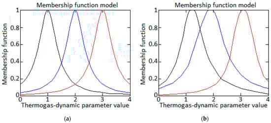 According to [], the fuzzy variable bell-shaped membership function use is justified in cases where it is necessary to more flexibly control the membership shape and distribution around the central value. Unlike the sigmoid function proposed in [], which has a more limited range and faster saturation, the bell function allows us to more precisely tune the curve shape and adapt it to the system-specific requirements. This is especially useful in cases where there is a need to account for data uncertainty and varying degrees of fuzziness, or when there are multiple peaks in the distribution.
