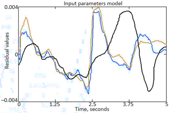 having orders qk and sk, differing in the general case from q and s, while uk(i − 1)…uk(i − qk) are scalar control actions, x(i) is a dimension v input disturbances vector, and ck is a parameters settings vector. The orders qk and sk indicate feedback delay and input signal delay, respectively. The introduction of a noise term (error) ϵk(i) into the compensator Equation (4) is justified by the need to take into account non-idealities and variable environmental conditions. In real-world conditions, measurements may be subject to noise, interference, or other external factors that may cause the compensator to operate inaccurately. In addition, even when using an accurate mathematical model, modeling errors and internal inaccuracies in compensator components, such as imperfections in design or calibration, are inevitable. The noise term introduction allows us to take these factors into account and make the compensator model more realistic, ensuring its better adaptability to real operating conditions.