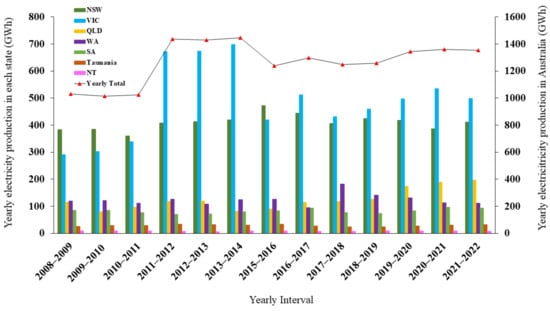 Generally, it is anticipated that 100 m3 of biogas with a 6 kWh/m3 energy content (CH4 content of 60%) will be produced from 1 tonne of mixed garden and food organics (biowaste). Figure 1 [13] shows the breakdown of electricity generated by biogas in Australia by state. It not only shows the overall increase but also the growth that each region has experienced over time. This provides scientists and investors with a promising incentive to pursue contemporary biogas production solutions by utilising all available technologies.
