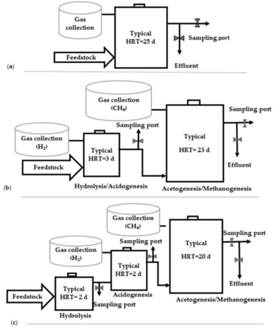 For each of the four steps, the double- or multi-stage process occurs in a separate chamber. In the first reactor, the processes of hydrolysis, acidogenesis, and acetogenesis occur [159,160]. Methanogenesis is typically employed in the second reactor. According to studies, the acidification stage takes place when the hydraulic retention period is 2–3 days, and the pH is 5.5 to 6.6, but the slow-growing methanogenic bacteria need a longer retention time of 20–30 days and an alkaline pH of 7–8 [161]. Two-stage or multi-stage reactors have a number of advantages, including increased CH4 generation, a higher organic loading rate, improved processing stability, better pathogen control, and increased effectiveness in removing volatile solids. The complicated operation, greater maintenance costs, and higher installation capital expenses are the key negatives, nevertheless. Both procedures produced comparable results when compared at a retention period of 30 days, but the double-step process produced more biogas and degraded materials more effectively. It was also noticed that the multiple stages produced greater net energy at a lower cost and with a simpler post-remediation dewatering process.