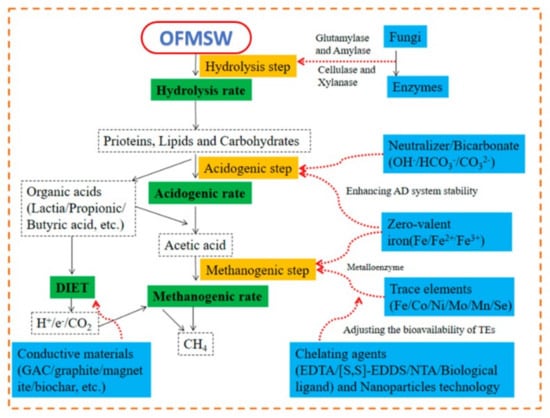 - Li, X.; Wang, Z.; He, Y.; Wang, Y.; Wang, S.; Zheng, Z.; Wang, S.; Xu, J.; Cai, Y.; Ying, H. A Comprehensive Review of the Strategies to Improve Anaerobic Digestion: Their Mechanism and Digestion Performance. Methane 2024, 3, 227–256. [Google Scholar] [CrossRef]