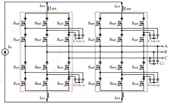 In contrast, parallel CSCs are easier to implement and have gained increasing attention due to the modularity, simpler structure, enhanced fault tolerance and reliability, extended power range, and better harmonic performance []. Parallel CSCs can be categorized into two different types: independent DC link and shared DC link. For the independent DC bus structure, the DC bus current of each CSC module can be independently controlled, allowing the additional control freedom to focus on improving AC output quality, suppressing common-mode resonance, and reducing circulating currents by suppressing common-mode voltage [,]. The drawback is that multiple constant current sources are needed which increase the system complexity and cost. On the other hand, for the shared DC bus structure, DC bus current balancing becomes the main issue. The imbalance of bus current is often caused by the following factors: (1) discrepancies in the DC-side inductance and windings; (2) differences in the conduction voltage drop of the switches; (3) time delays in the gate control signals between multiple CSCs. Unbalanced DC current can degrade AC output quality, reduce system stability, and even damage devices due to overcurrent [].
