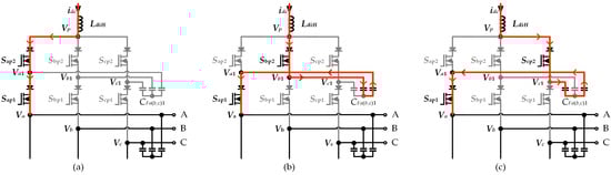 In the upper half-bridge, the switches Sap1/3, Sap2/4, Sbp1/3, Sbp2/4, Scp1/3, Scp2/4 are used, while in the lower half-bridge, the switches San1/3, San2/4, Sbn1/3, Sbn2/4, Scn1/3, Scn2/4 are employed. At the same time, regardless of the states of the even group switches, the output current is entirely determined by the states of the odd group switches. The states of the even group switches will influence the current paths through the FC. Figure 2 shows different kinds of current loops corresponding to different even group switch choices when Sap1 is on. When Sap1 and Sap2 are both on, the current does not flow through the FC, and thus the FC is not involved in charging or discharging, keeping the capacitor voltage constant. When Sap1 and Sbp2 are both on, FC(CFa1) will discharge, while FC(CFb1) will charge. Therefore, the FC voltage can be controlled without affecting the output current by designing the states of the even group switches. The impact of different switching states on the FC voltage is listed in Table 1. Where “↑” represents the FC voltage rise, and “↓” represents the FC voltage fall. It is important to note that the FC voltage and the output voltage will entirely determine the blocking voltage of each set of switches. For instance, in Figure 2a, with Sap1 and Sap2 conducting, they do not bear the blocking voltage. The blocking voltage of the remaining switches is given by the following expression: