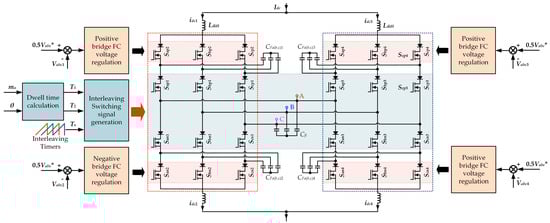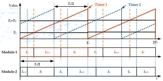Figure 4 illustrates the PWM diagram of the designed interleaved three-segment SVM. By comparing the triangular carrier with the calculated duty cycles, the digital implementation of SVM can be achieved. The sequence of vector application can be flexibly designed to achieve multiple objectives, such as harmonic performance and switching loss. For parallel modules, two different timers with a half-cycle phase shift are used as carriers, and they share the vector dwell times. As a result, the two modules will produce interleaved three-level current outputs, and the combined output will present a five-level output.