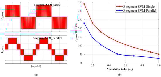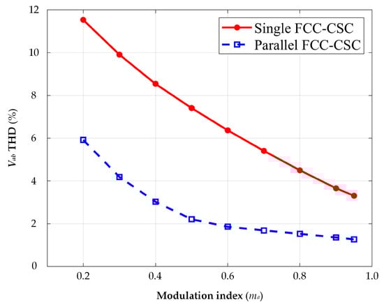 Figure 5a shows the PWM current waveforms of a single and a parallel FCC-CSC. The parallel FCC-CSC system can increase the current levels through interleaved SVM, thereby improving the quality of the output power. The harmonic analysis of the output currents for a single and a parallel FCC-CSC is shown in Figure 5b. Compared with the single FCC-CSC system, the parallel FCC-CSC system with interleaved SVM has improved output harmonics over the entire modulation index range. Moreover, the improved output power quality will further enhance the FC voltage control performance according to the analysis.