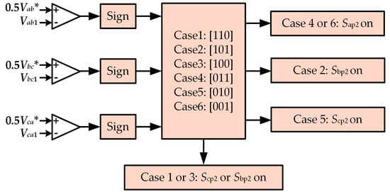 In addition to achieving current balance, a more crucial task for the even group switches is to control the FC voltage to ensure the voltage balance of the switches. In the practical operation of the FCC-CSC system, the output and FC line voltages are often sampled. To avoid complex calculations, the line voltage is directly used as the feedback variable for control. During operation, when the FC line voltage is less than half of the output line voltage, it is recorded as logic “0”. When the FC line voltage is larger than half of the output line voltage, it is recorded as logic “1”. There are 8 combinations for the three-phase logic ranging from [000] to [111]. However, since the FC line voltages are star-connected and follow the three-phase symmetry principle, the situation where all three-phase FC line voltages are either larger than or less than half of the output line voltage will not occur. Therefore, there are only 6 possible cases for the relationship between the FC voltage and the output line voltage, labeled as [001] to [110], and referred to as Case 1 to Case 6.