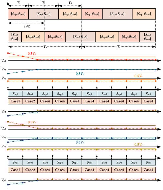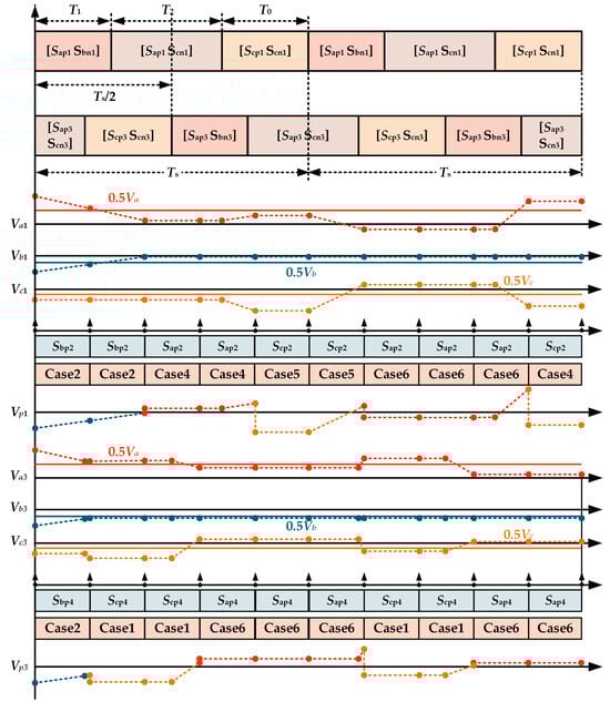 From the analysis in Table 1, it can be derived that the selection of the even group switch states depends on the current case and the states of the odd group switches. Figure 6 illustrates the selection of the even group switch states for each case when Sap1/3 is on. Figure 7 shows the FC voltage regulation diagram when using the traditional three-segment SVM modulation.