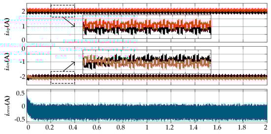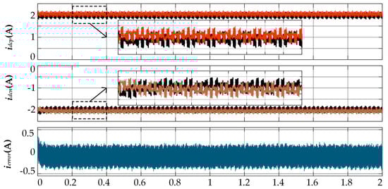 Figure 10 and Figure 11 show the bus current simulation results of the two sub-modules before and after current balance, respectively, as well as the total error. In the simulation, the FCC-CSC system’s front end uses an ideal current source, and ideal components are employed to avoid the sub-DC bus current imbalance caused by component parameter errors. The total error is defined as follows:
