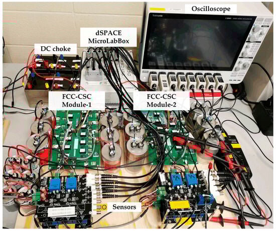 The experimental setup is shown in Figure 12, consisting of a DC current source and two FCC-CSC modules. The system status is sampled through sensor modules and fed back to the dSPACE system for computation. Control signals are then generated and sent out by the dSPACE system. The FCC-CSC-type switch is realized by the series-connected SiC MOSFET (C3M0032120K) and Diode (IDWD40G120C5).