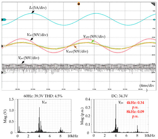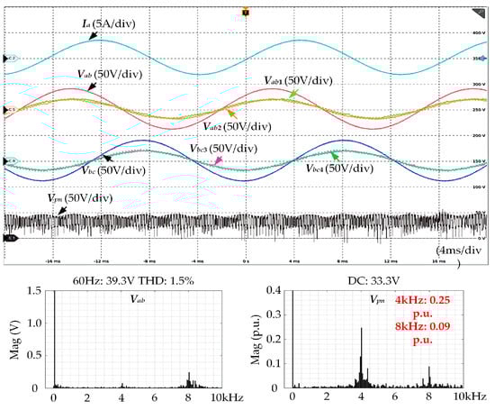 Moreover, the improved output voltage also facilitates FC voltage regulation because the output voltage serves as the reference value for FC voltage regulation. The DC bus voltage varies with the switching states of the even group switches, corresponding to the FC voltages of each phase. Therefore, the quality of the DC bus voltage benefits from the enhanced FC voltage control performance, showing improvement as well. From the experimental results, the primary harmonic content near 4 kHz in the bus voltage was reduced from 0.34 p.u. to 0.25 p.u.